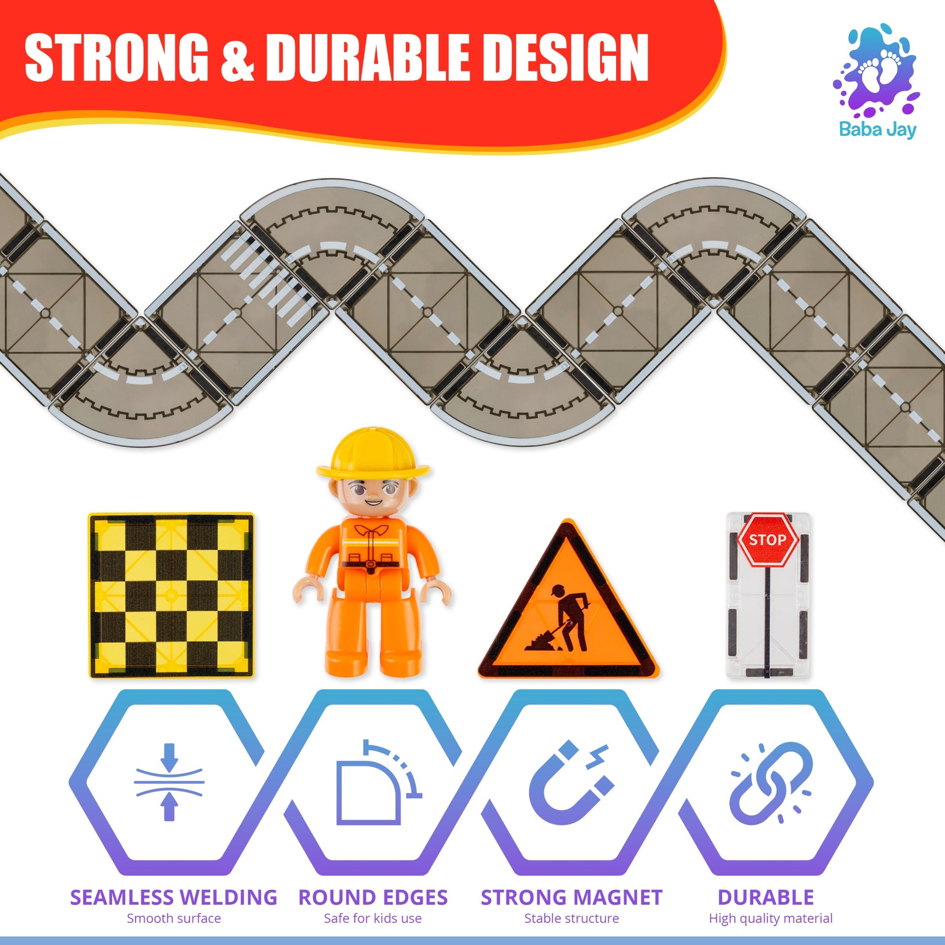 Ready, set, go! Expand your tile town with this 14-piece road set from Baba Jay, featuring 10 straight and 4 corner road tiles. Build a racetrack, city street, or winding country road - the possibilities are endless! Each piece connects seamlessly with the Baba Jay Magnetic Tiles range for smooth, sturdy layouts that spark hours of creative play.